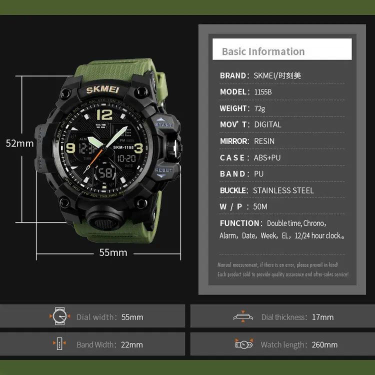 این ساعت مچی آنالوگ اسپرت با صفحهای گرد و پشت استیل ضد زنگ عرضه میشود. صفحه توسط شیشه معدنی محافظت میشود و برای راحتی بیشتر، بند Designer با پرداخت Precious Finishing دارد. زمان توسط یک تاج در کنار ساعت کنترل میشود. این ساعت برای لباسهای اسپرت و غیررسمی بسیار مناسب است. این ساعت به جوانان بسیار توصیه میشود.این ساعت با توجه به قیمتش امکانات مناسبی مانند ضد آب بودن تا عمق ۵۰ متر، تاریخ، و نمایشگر دیجیتال دارد. کاربران از ظاهر زیبا و خوش دست بودن آن رضایت دارند و عقربههای شب نما را نیز مورد تحسین قرار دادهاند.این ساعت دارای طراحی شیک و زیبا، قاب استیل ضد زنگ و بند لاستیکی راحت است. صفحه نمایش بزرگ و واضح آن، خواندن زمان را با یک نگاه آسان میکند.ساعت اسکمی ۱۱۵۵ ضد آب است و در برابر پاشش آب و غوطهوری کوتاه مدت در آب مقاوم است. همچنین دارای زنگ هشدار داخلی است که به شما امکان میدهد یادآوری تنظیم کنید یا به موقع بیدار شوید. این ساعت هم تاریخ و هم روز هفته را نمایش میدهد. ساعت اسکمی ۱۱۵۵ با موتور کوارتز خود، زمان دقیقی را نشان میدهد.