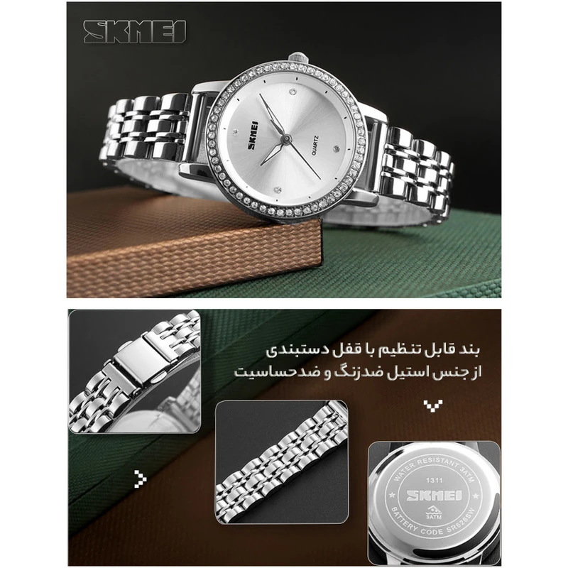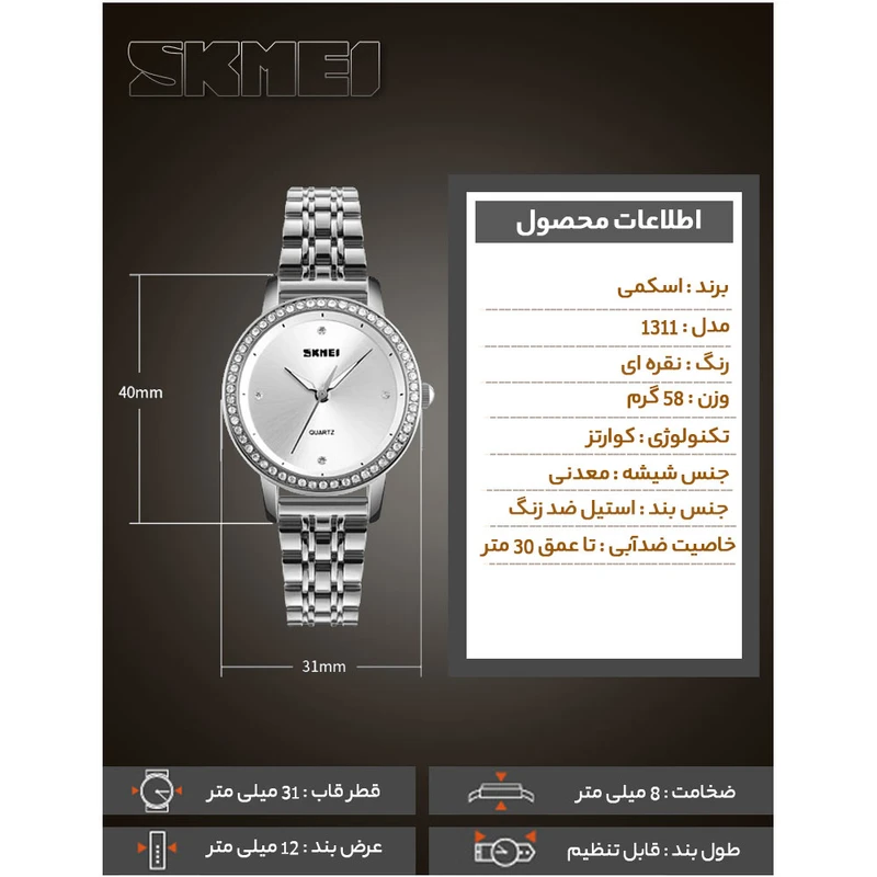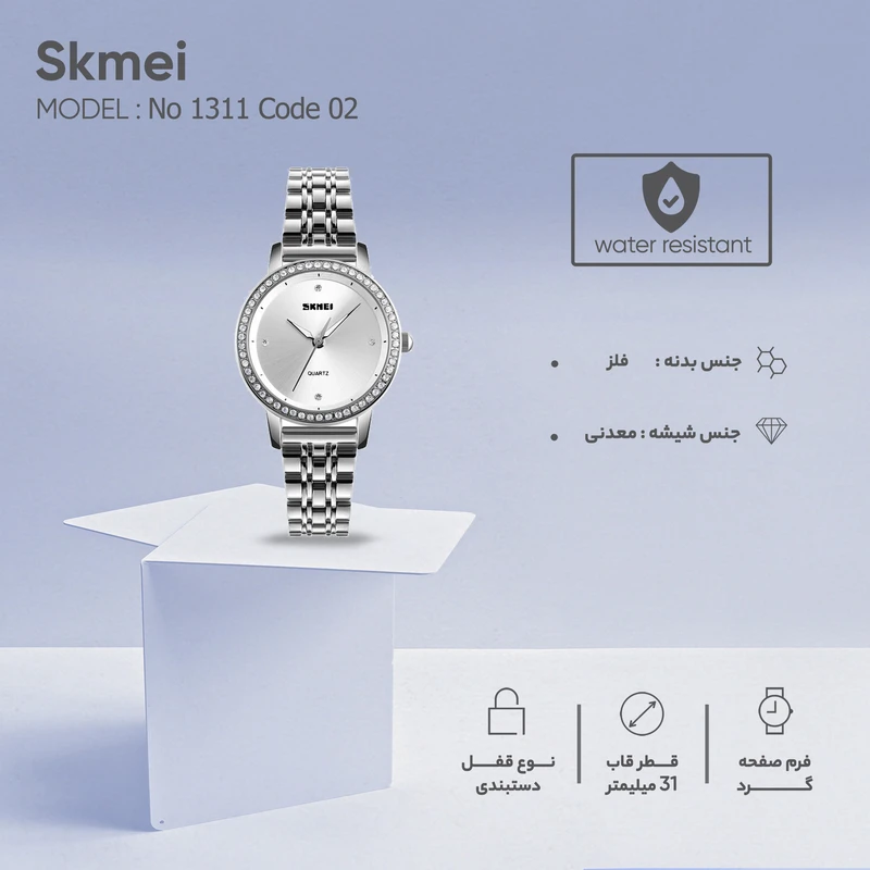 این ساعت صفحه ای گرد از جنس فلز دارد که بهوسیله بندی تماما نقرهای دور مچ قرار میگیرد. قفل آن دستبندی بوده و جنس شیشه آن معدنی است. میزان مقاومت این ساعت در برابر آب 3ATM است و چون از فلز ضد زنگ ساخته شده آسیبی به آن وارد نمیشود.
