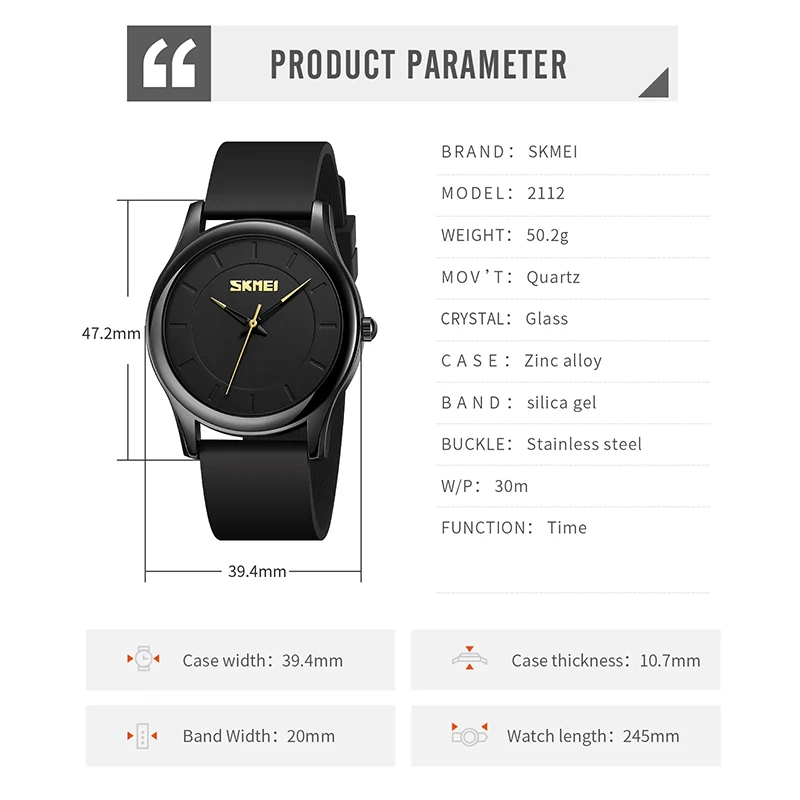 ساعت کوارتز کلاسیک SKMEI 2112 ظرافت مدرن را با کارایی روزمره ترکیب میکند و آن را به یک اکسسوری عالی برای لباسهای غیررسمی و رسمی تبدیل میکند.از زمانسنجی دقیق با مکانیزم کوارتز با دقت بالا و قابل اعتماد لذت ببرید و ثبات و اطمینان را در برنامه روزانه خود تضمین کنید.طراحی شده برای مقاومت در برابر پاشش آب و غوطهوری کوتاه در آب، که آن را برای استفاده روزانه ایدهآل میکند (برای شنا یا غواصی مناسب نیست).دارای قابی از جنس آلیاژ روی بادوام، شیشه کریستالی ضد خش و بند نرم و انعطافپذیر از جنس ژل سیلیکا برای راحتی و دوام طولانی مدت.یک ساعت شیک و کاربردی، که آن را به هدیهای عالی برای تولد، سالگرد یا تعطیلات تبدیل میکند.