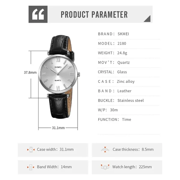 ساعت چرمی زنانه با نیروی محرکه کوارتز ۱۰۰٪ باکیفیت . این ساعت میتواند نیازهای مختلف شما را در زندگی روزمره برآورده کند و راحتی را برای شما به ارمغان بیاورد.این ساعت نه تنها حس راحتی را برای مچ دست شما ایجاد میکند، بلکه به راحتی با لباسهای شما ست میشود . با ویژگی ضد آب تا عمق ۳۰ متر مناسب برای استفاده روزانه می باشد . ( برای حمام کردن، شنا، غواصی مناسب نیست ) . با دوام فوقالعاده و در صورت نگهداری صحیح، این ساعت زنانه میتواند یک عمر دوام بیاورد.