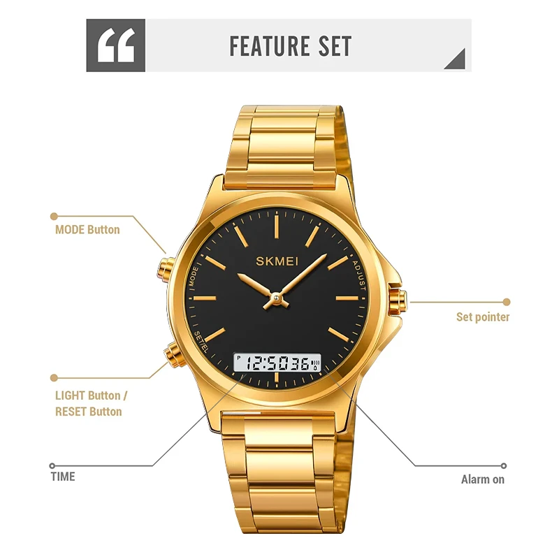 این ساعت SKMEI نمایشگر دوگانه آنالوگ-دیجیتال را با بند استیل ضد زنگ بادوام و مقاومت در برابر آب تا 3BAR ترکیب میکند و آن را برای ورزش و استفاده روزانه ایدهآل میسازد. این محصول دارای گواهینامه CE و RoHS است که انطباق با استانداردهای ایمنی اتحادیه اروپا را تضمین میکند و دسترسی به بازار را فراهم میکند. این ساعت دارای عملکردهای متعددی مانند زنگ هشدار، کرونومتر و نور پس زمینه است که تطبیقپذیری و راحتی را برای کاربران ارائه میدهد.