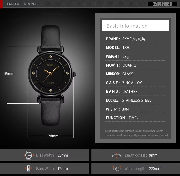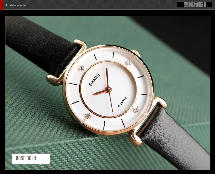 ساعت مچی زنانه SKMEI مدل 1330LRG کوارتز آنالوگ با بند چرمی و طراحی صفحه ساده ، ساعتی باریک و شیک و مد روز می باشد . این ساعت دخترانه از یک صفحه با روکش بادوام ضد انعکاس با کیفیت بالا برای جلوگیری از خش و آسیب استفاده میکند.